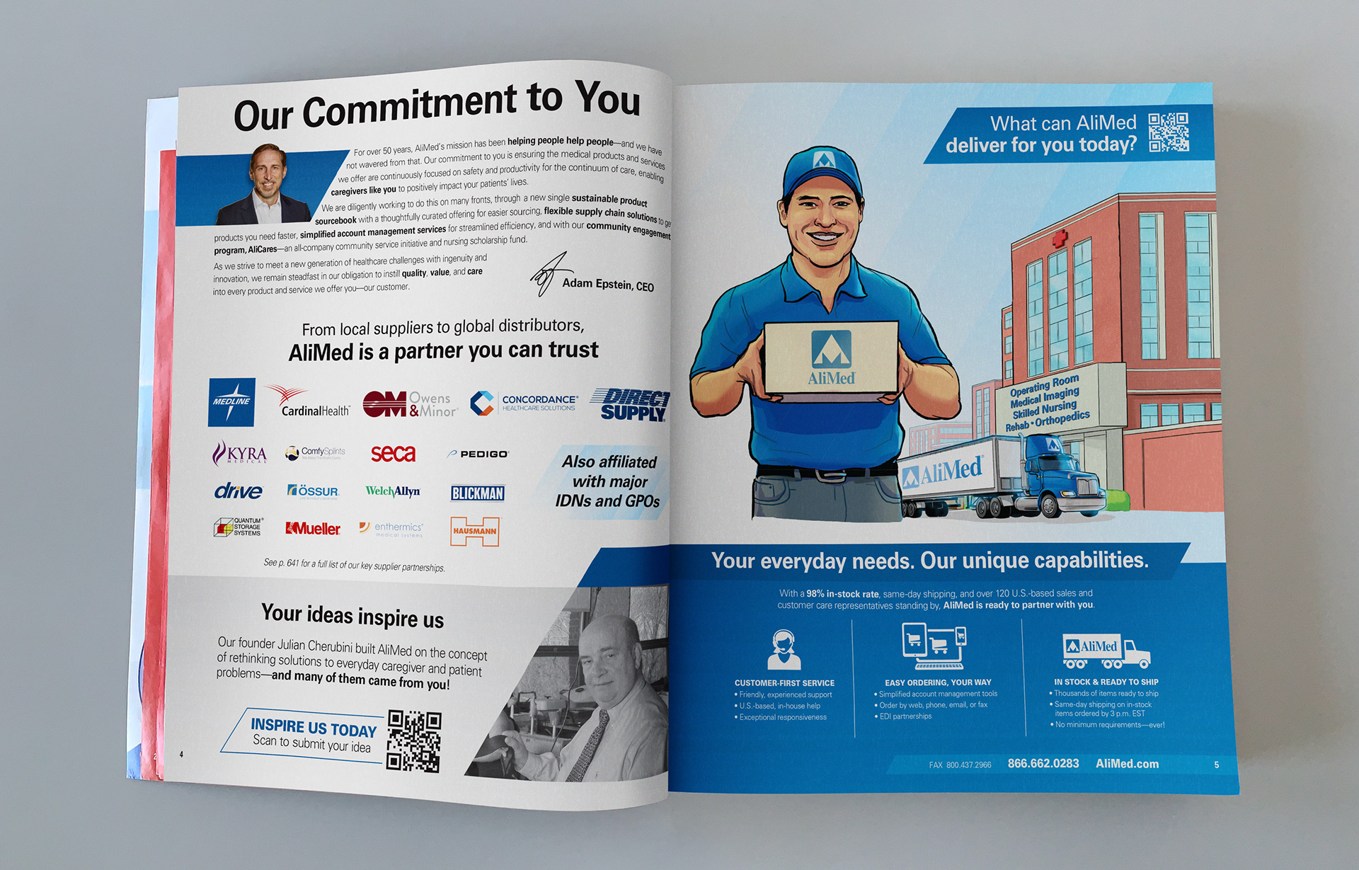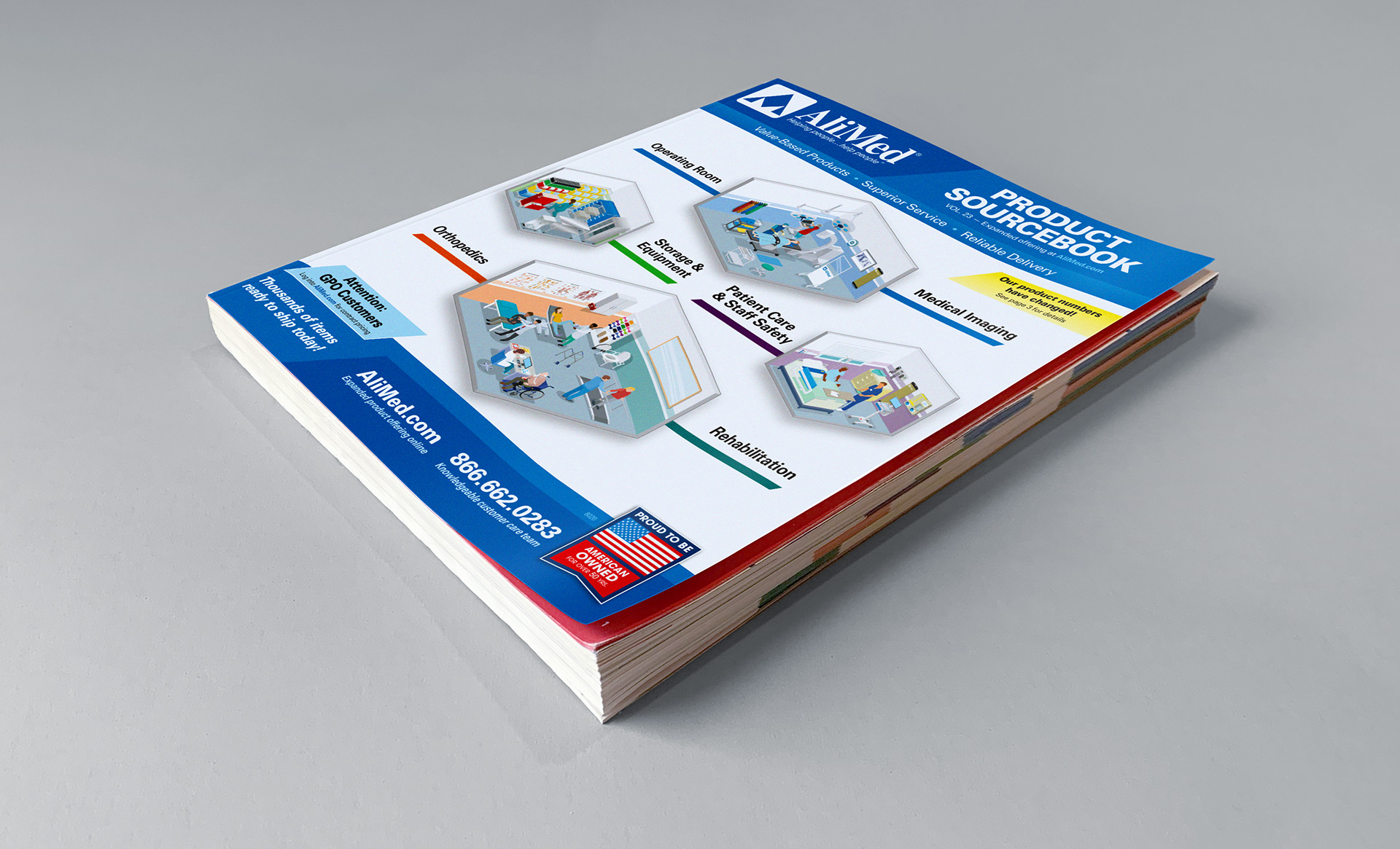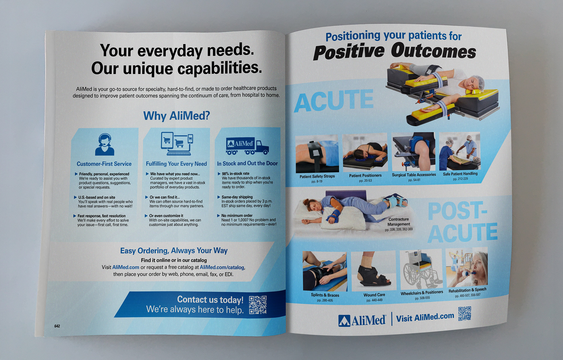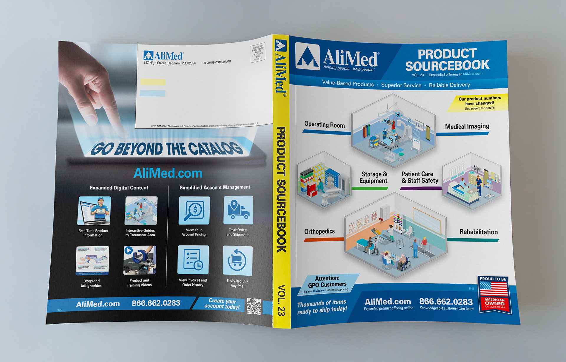 AliMed’s extensive product portfolio was historically presented across multiple annual catalogs spanning acute and post-acute care. This initiative consolidated all solutions into a single, modernized product sourcebook supported by a unified visual system. I led the redesign, establishing a cohesive look and feel from cover to cover, including six color-coded product categories with custom illustrations and introductory section spreads to improve navigation. QR codes connected print to web as part of a broader digital strategy, while a simultaneous transition to new 10-digit SKUs required every product layout to be rebuilt—making this a significant undertaking for the small team I led.
