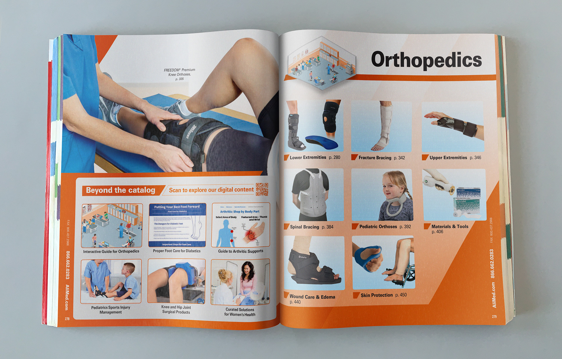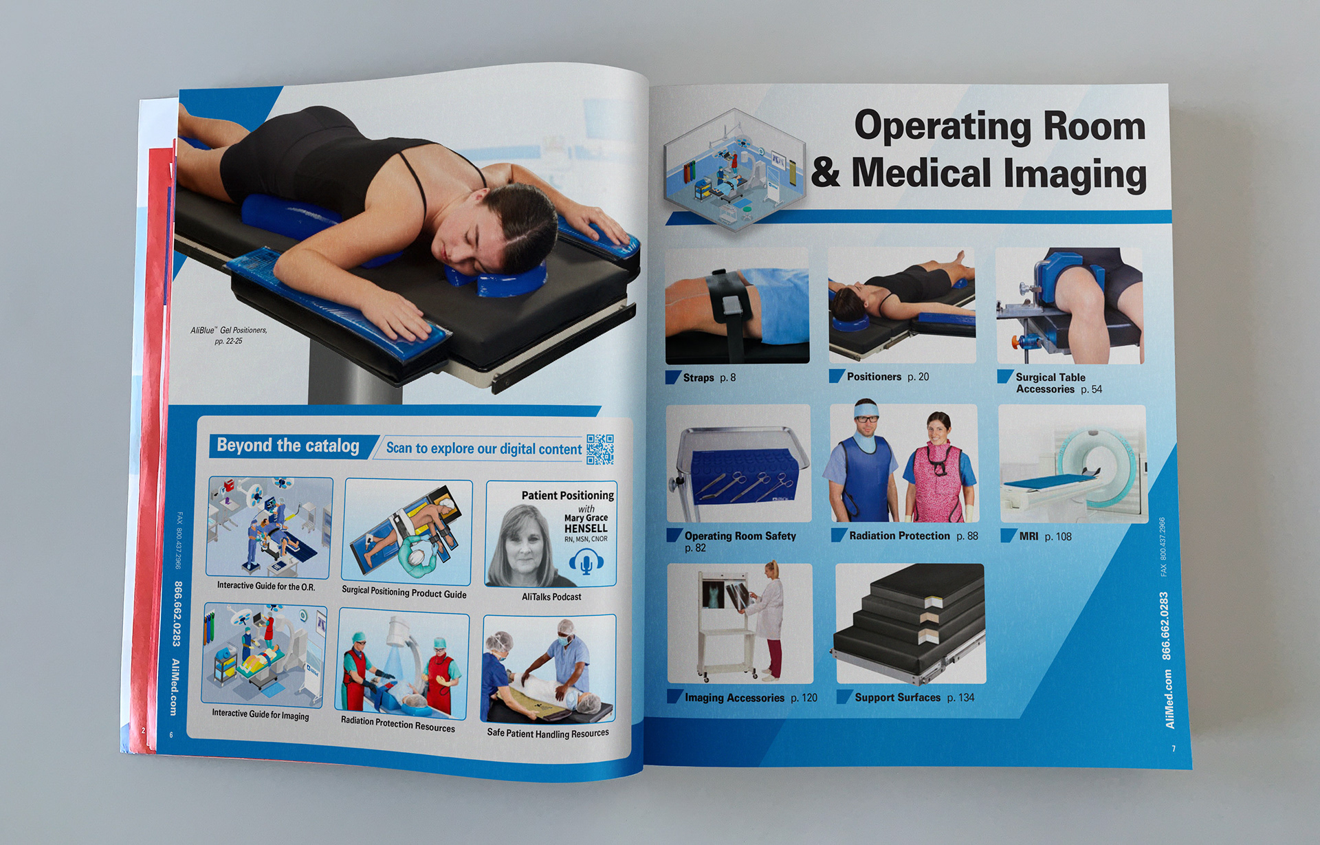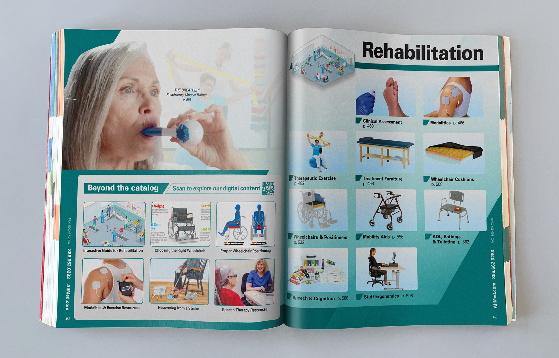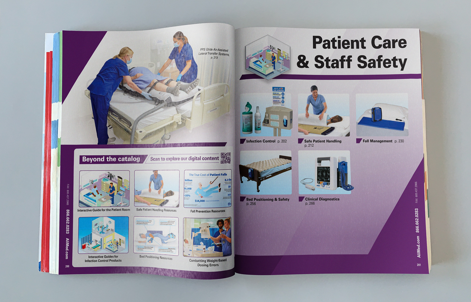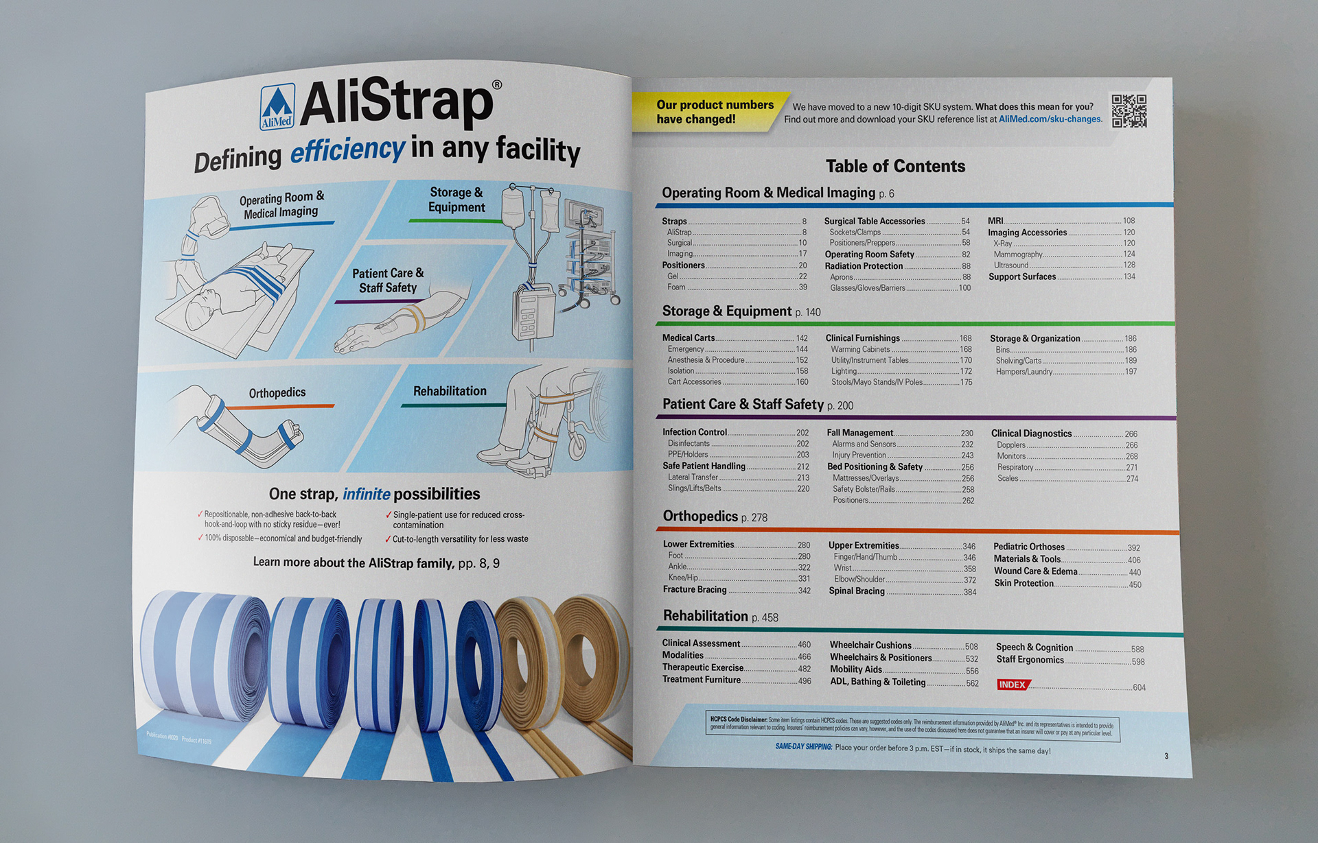 AliMed’s extensive product portfolio was historically presented across multiple annual catalogs spanning acute and post-acute care. This initiative consolidated all solutions into a single, modernized product sourcebook supported by a unified visual system. I led the redesign, establishing a cohesive look and feel from cover to cover, including six color-coded product categories with custom illustrations and introductory section spreads to improve navigation. QR codes connected print to web as part of a broader digital strategy, while a simultaneous transition to new 10-digit SKUs required every product layout to be rebuilt—making this a significant undertaking for the small team I led.