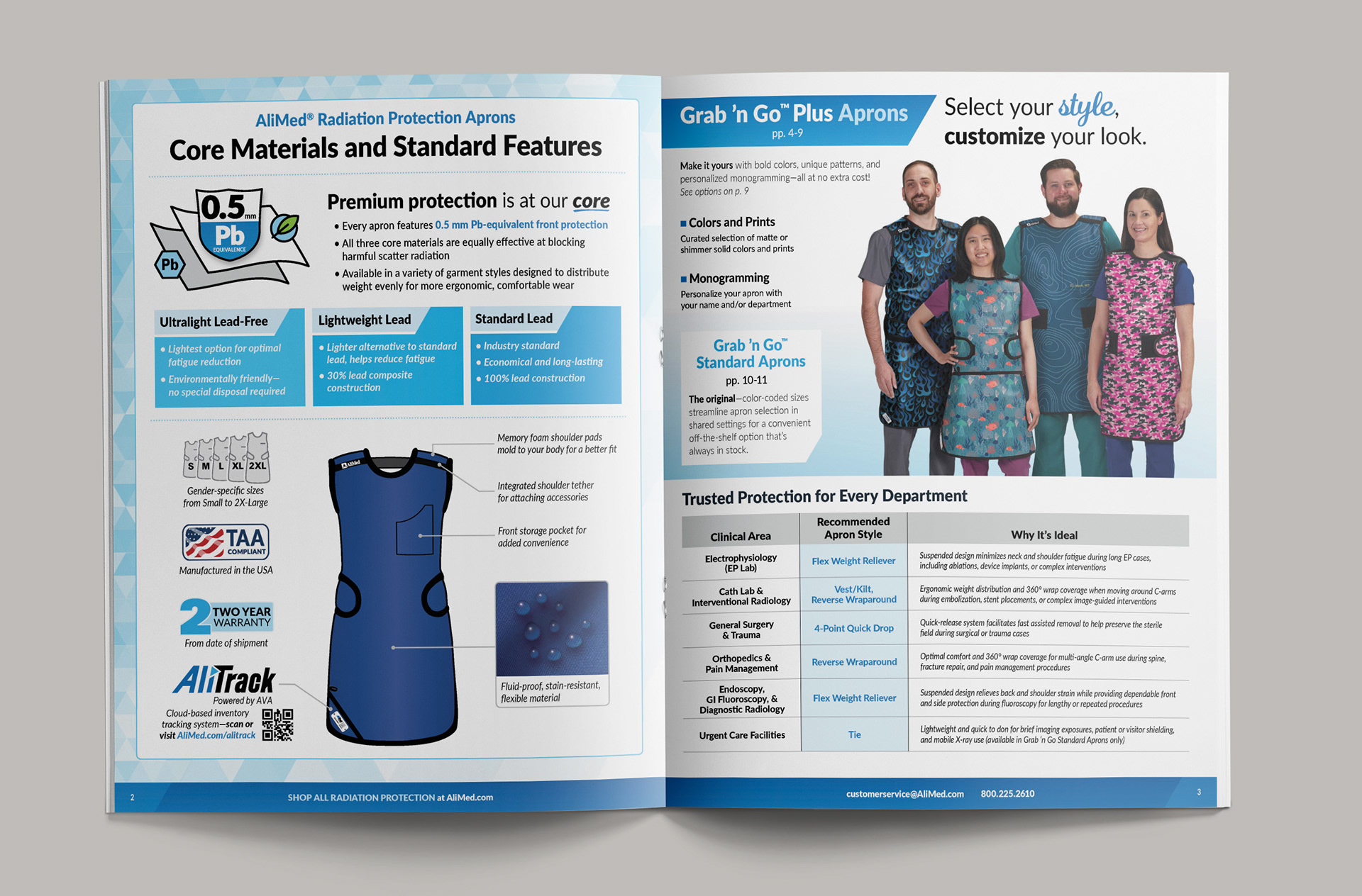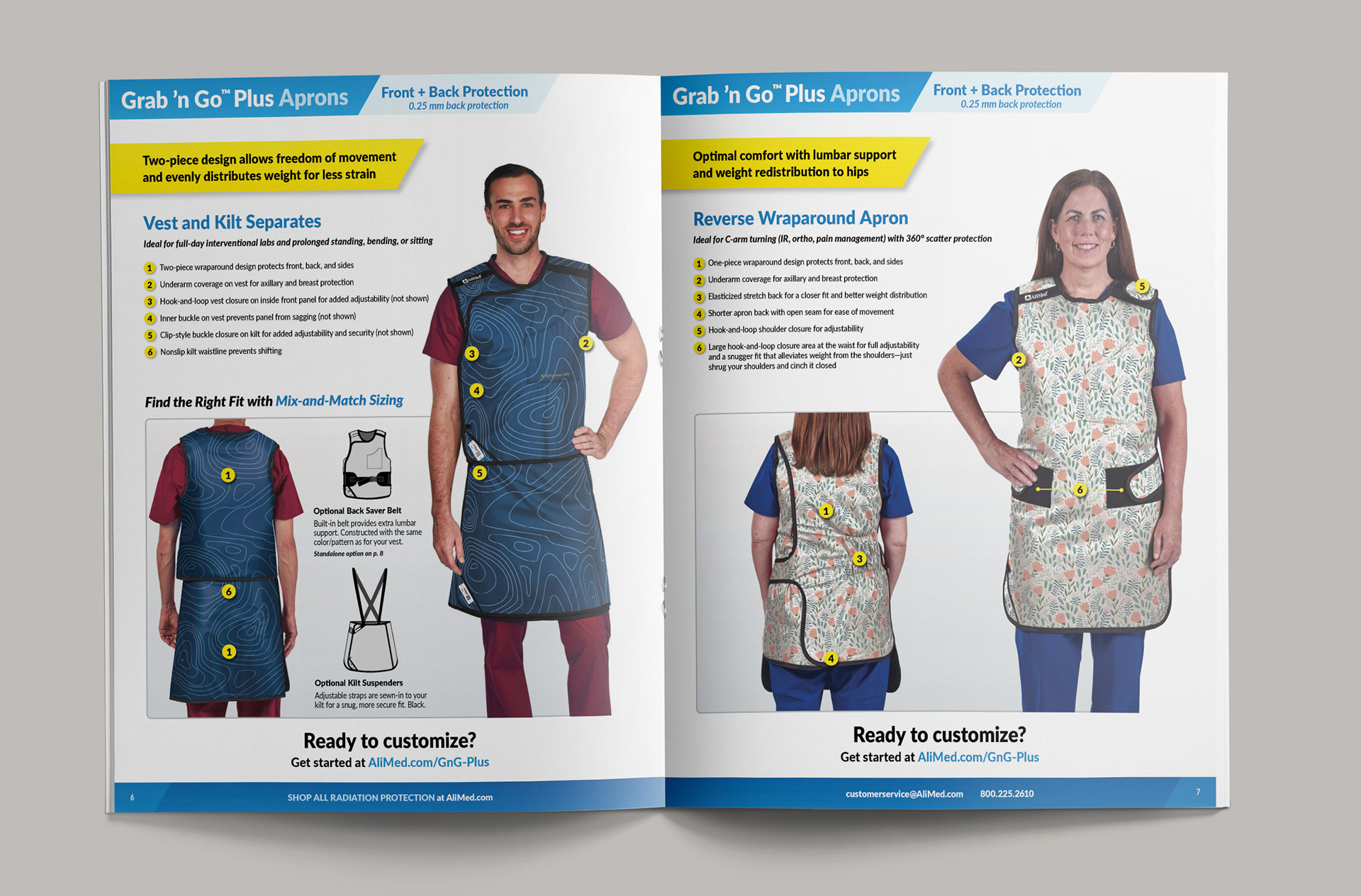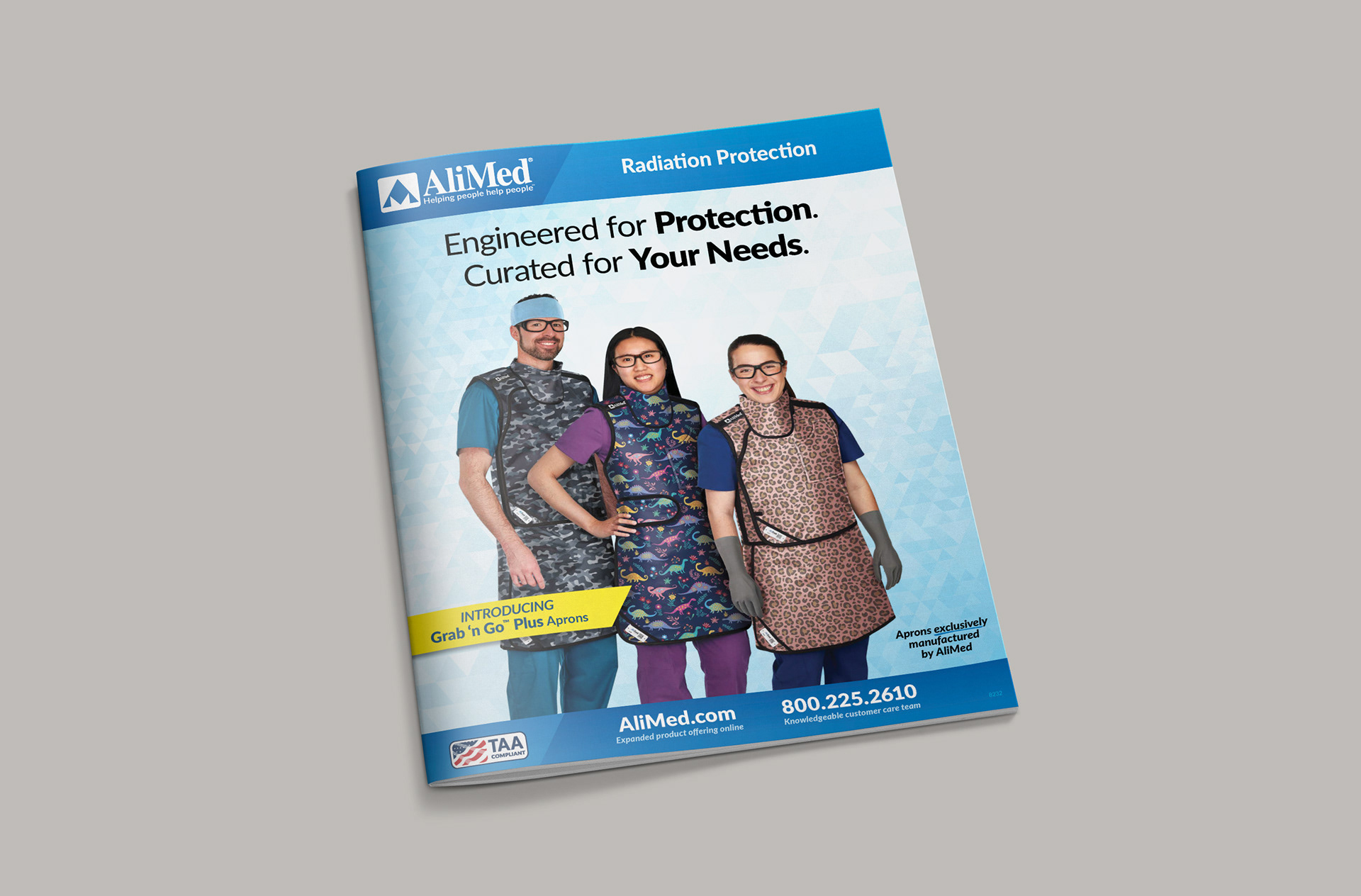 The new Grab 'n Go™ Plus Apron line for AliMed included updated apron designs and fitments as well as the creation of custom print pattens to expand the customization options. This required new photography to be shot as well as high-end retouching to apply the prints for realistic visuals since they were not production ready yet. A new sales brochure was designed to showcase all the new options for the customer.