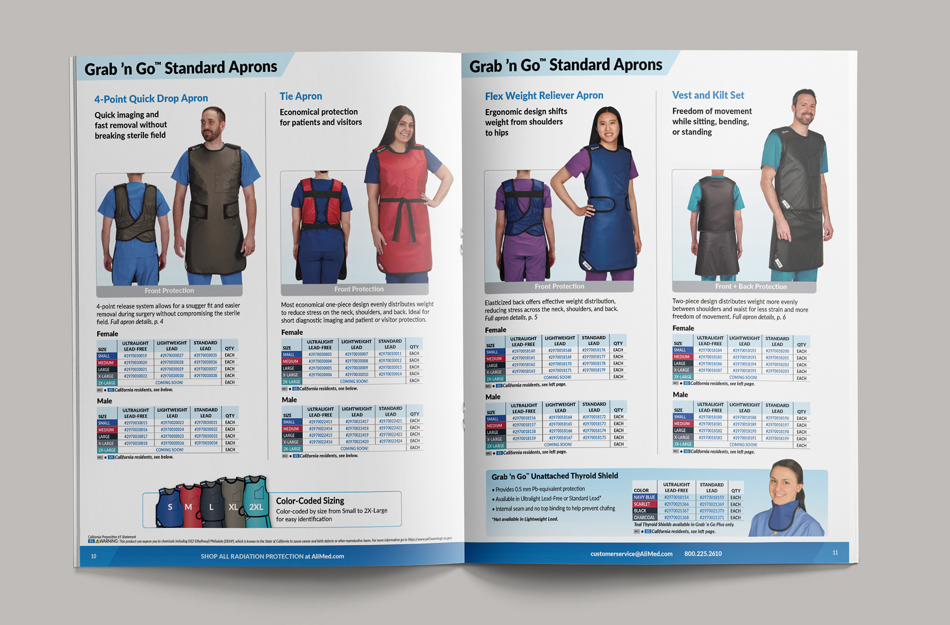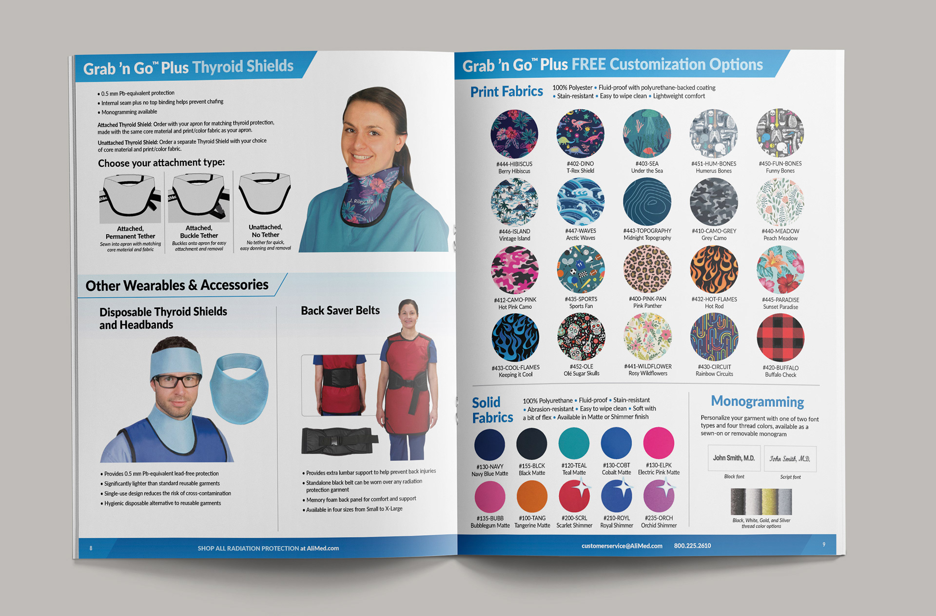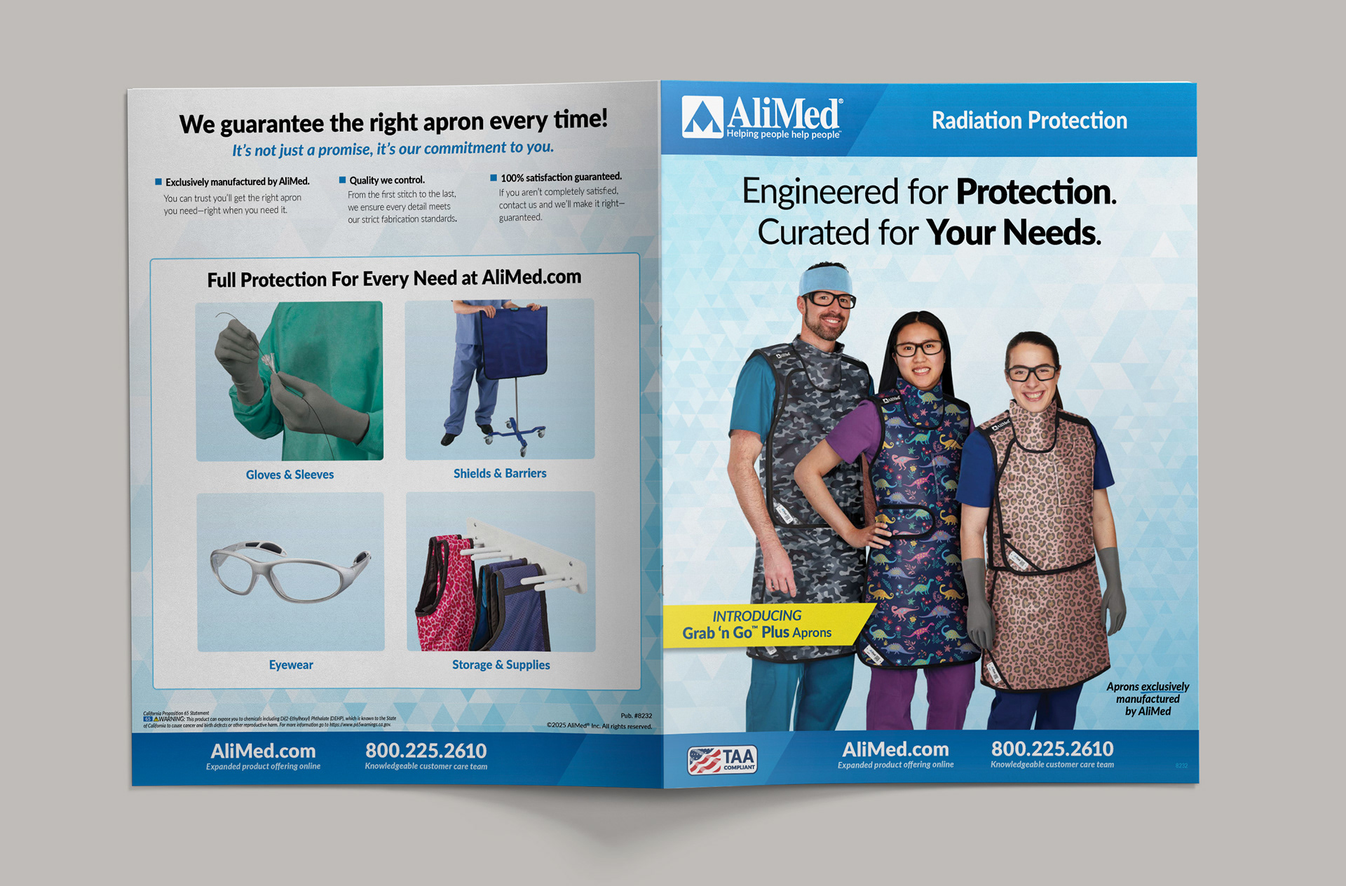 The new Grab 'n Go™ Plus Apron line for AliMed included updated apron designs and fitments as well as the creation of custom print pattens to expand the customization options. This required new photography to be shot as well as high-end retouching to apply the prints for realistic visuals since they were not production ready yet. A new sales brochure was designed to showcase all the new options for the customer.